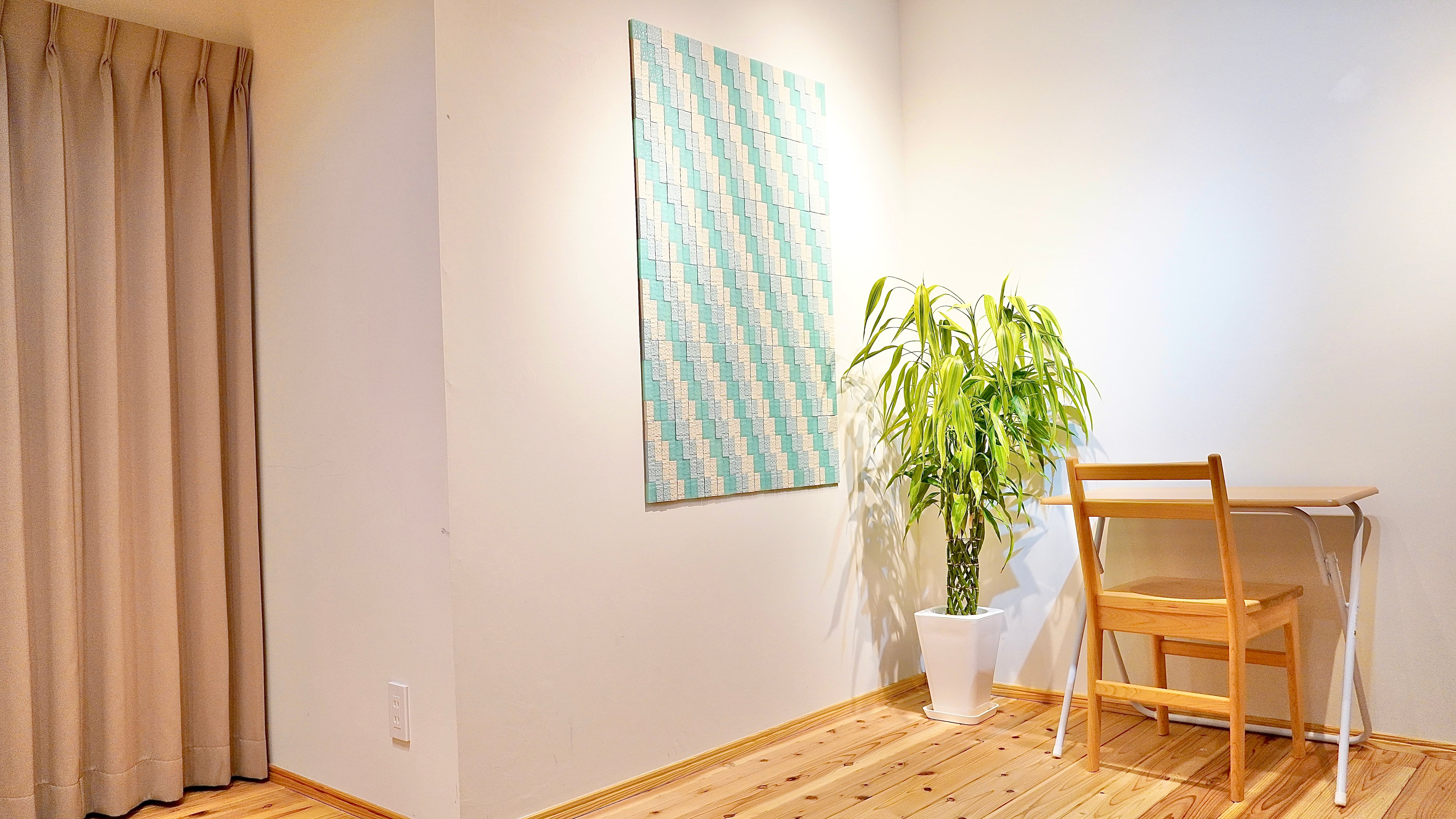 麻やコーンの壁タイルの一部に埋め込み夜間照明を消すと月のように輝き幻想的な空間をつくります。